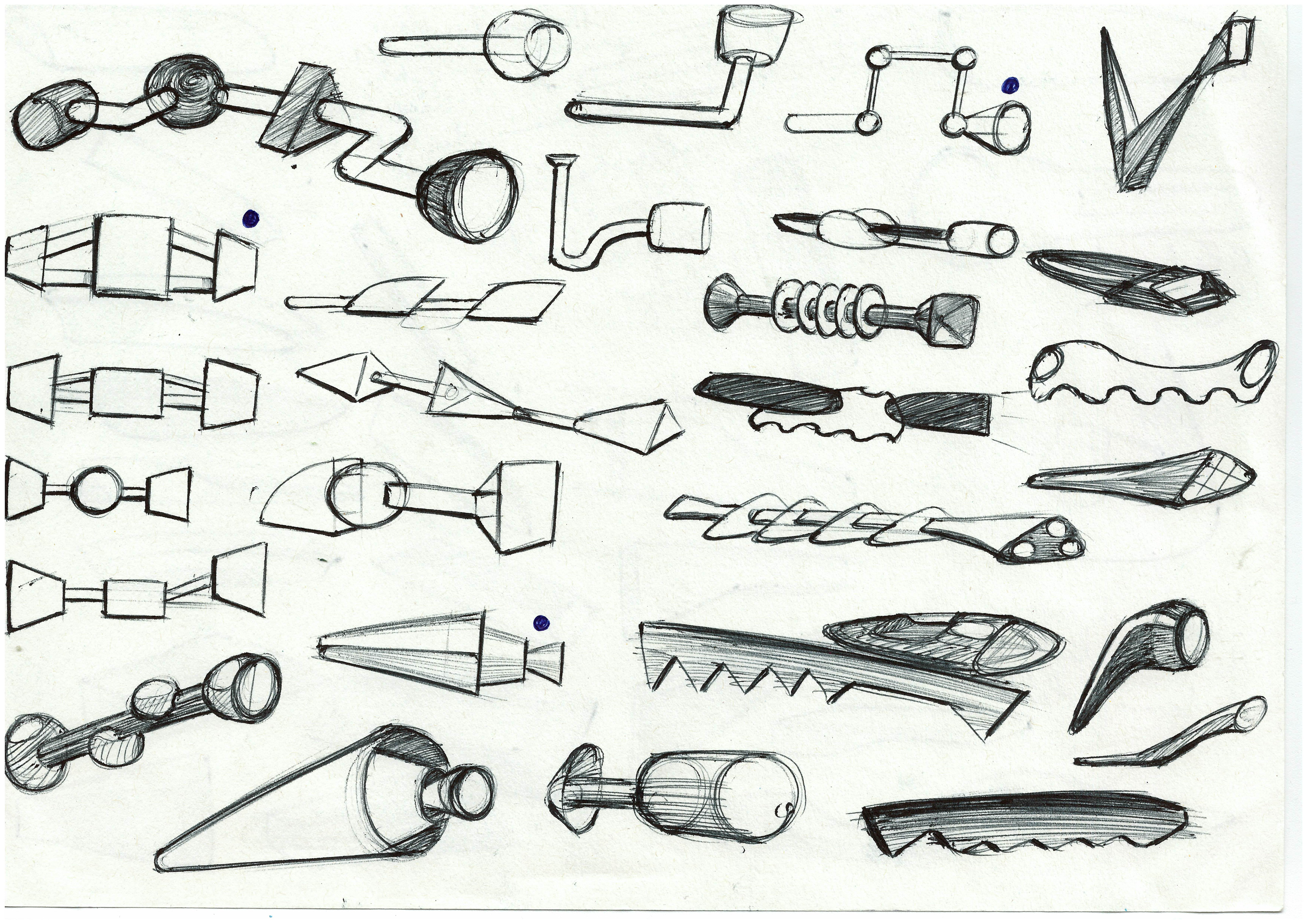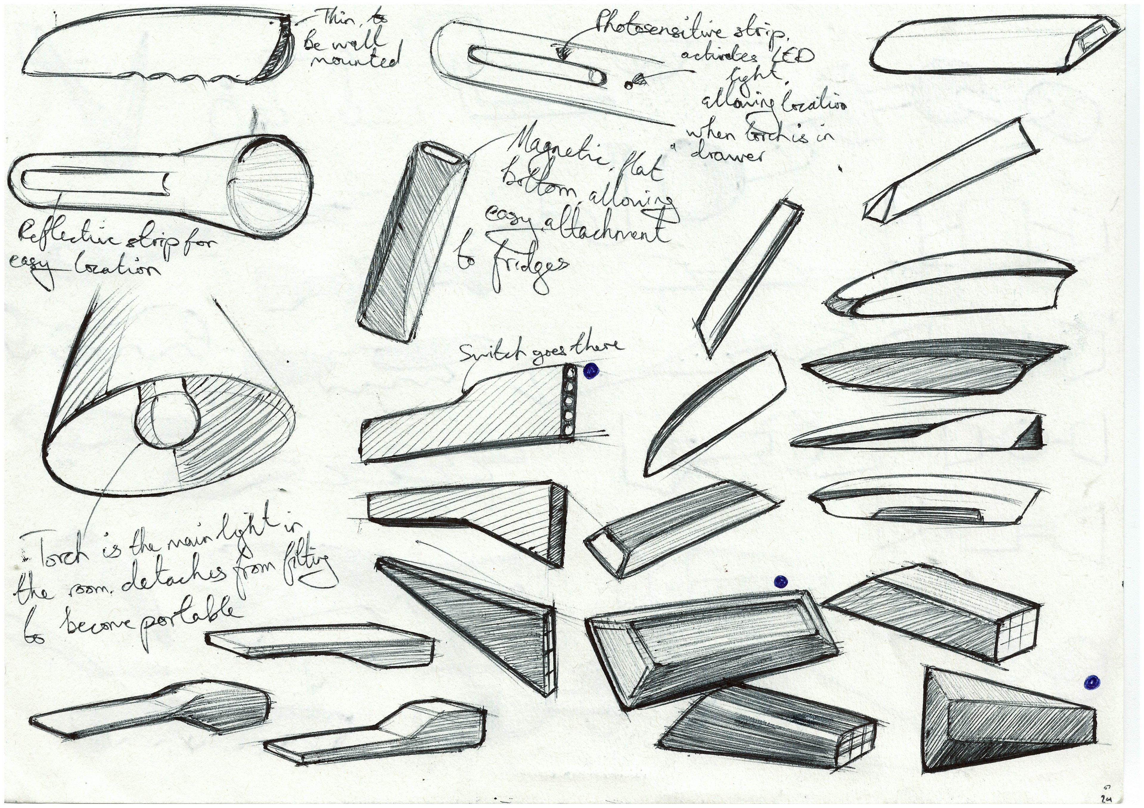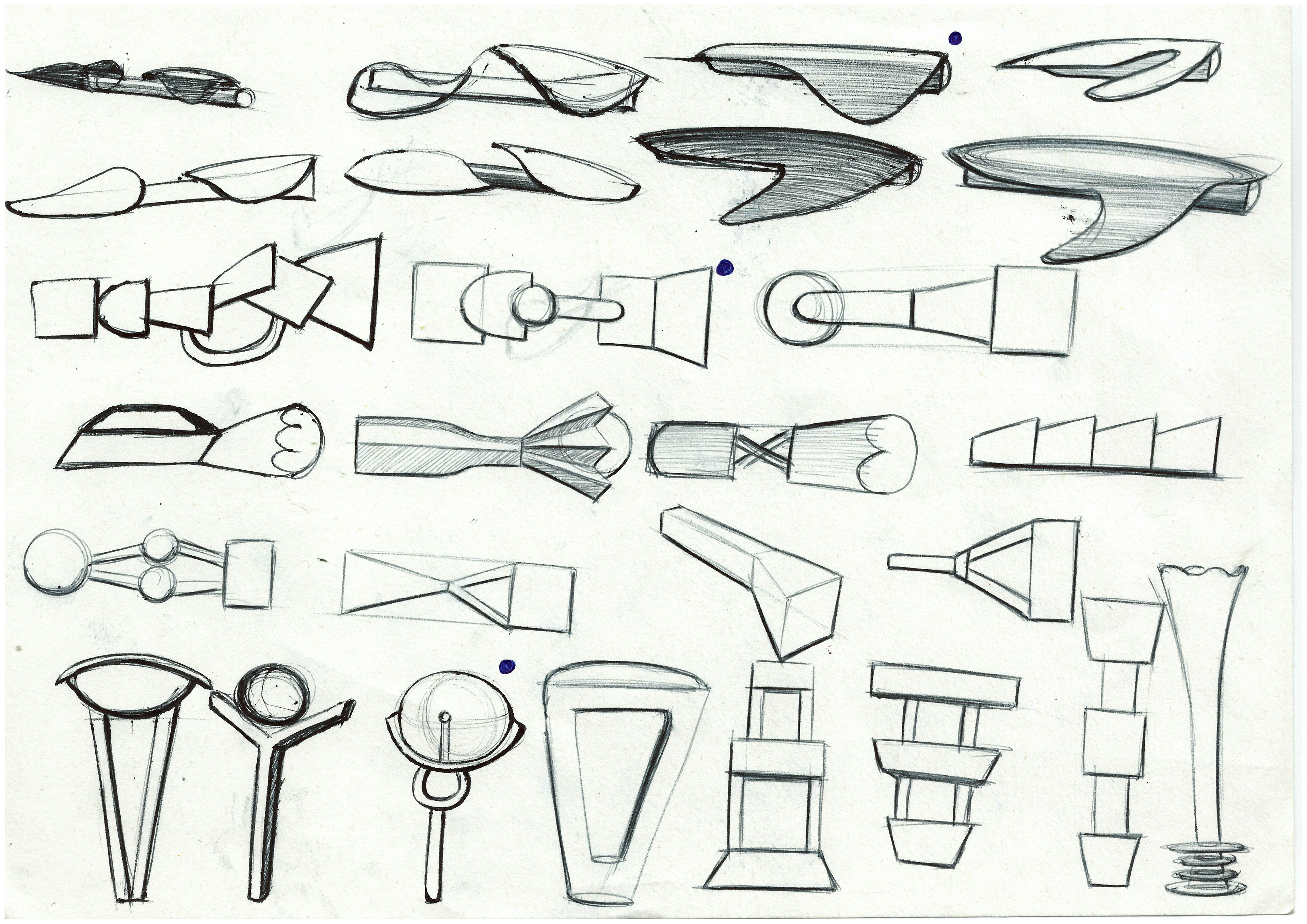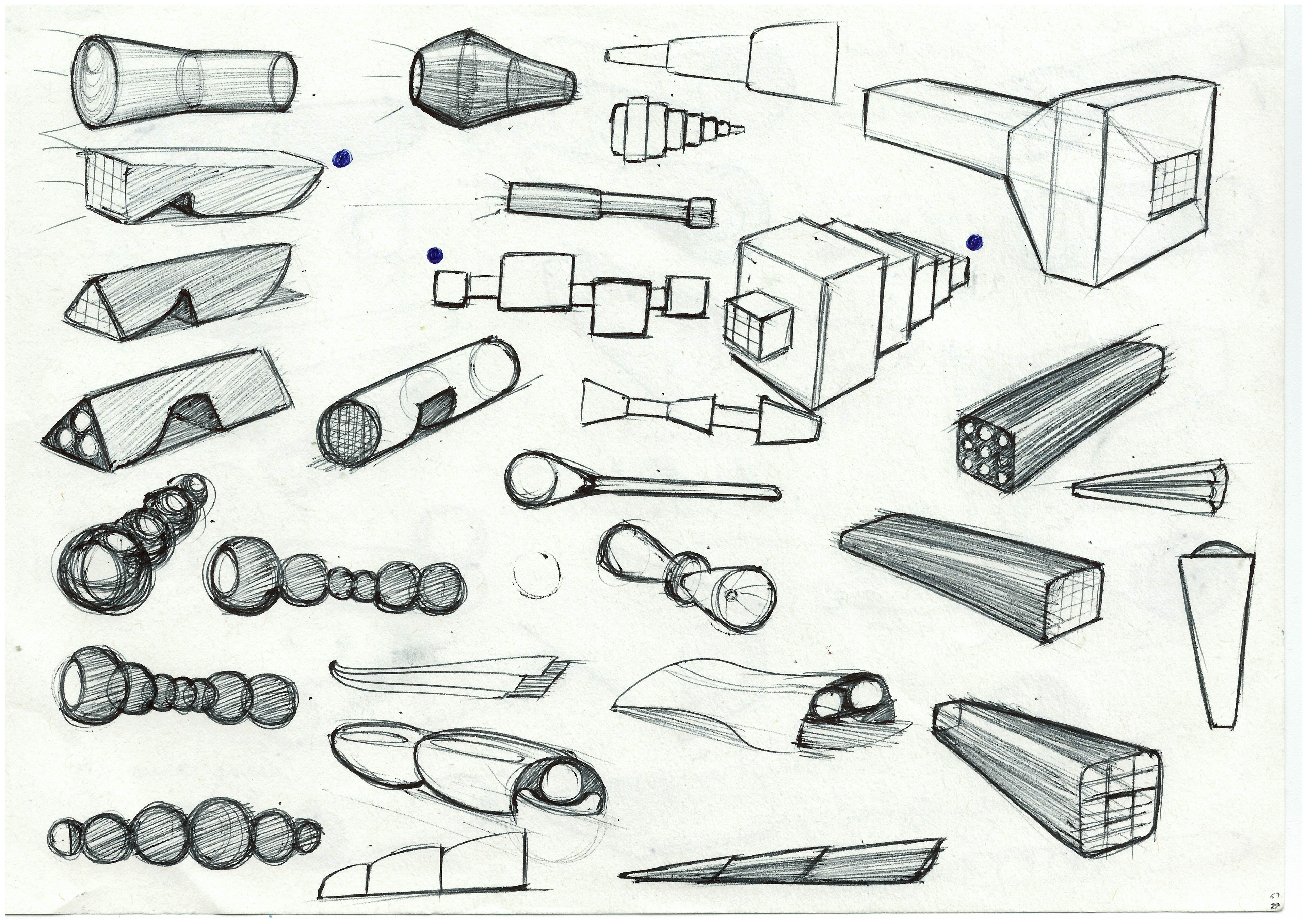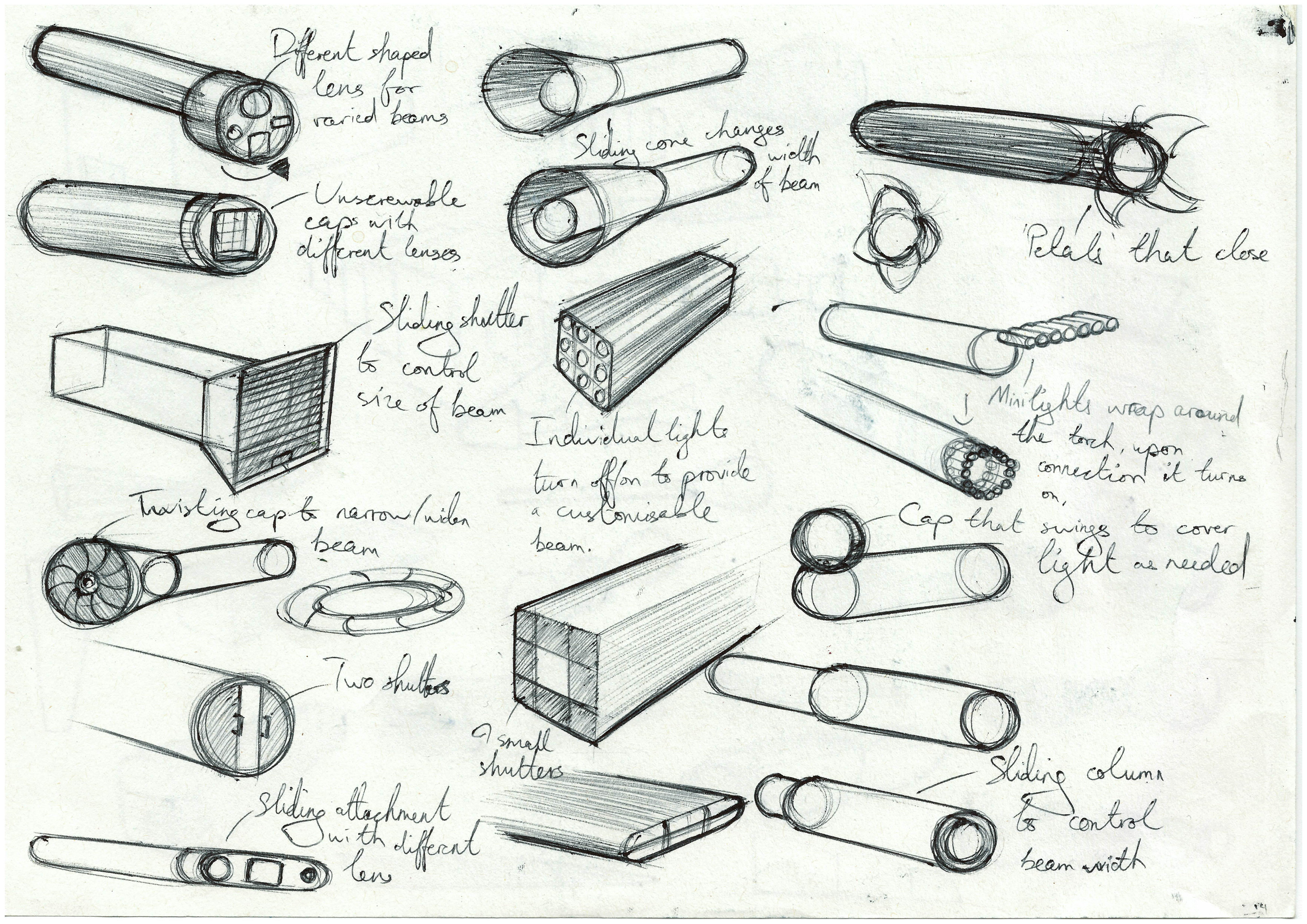 Research revealed to me that my user wanted a torch that was aesthetically pleasing and made a statement. Their favourite design period was postmodernism, and so I moved on to quick sketching to explore ideas. Low-fidelity modelling was next, allowing me to physically explore favourite designs.